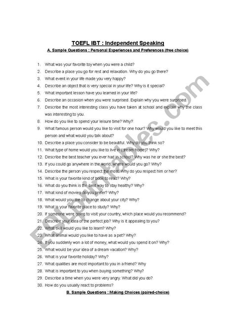 Read toefl sample speaking prompts Doc online is a convenient and frugal way to read toefl sample speaking prompts you love right from the comfort of your own home. Yes, there sites where you can get Doc "for free" but the ones listed below are clean from viruses and completely legal to use.